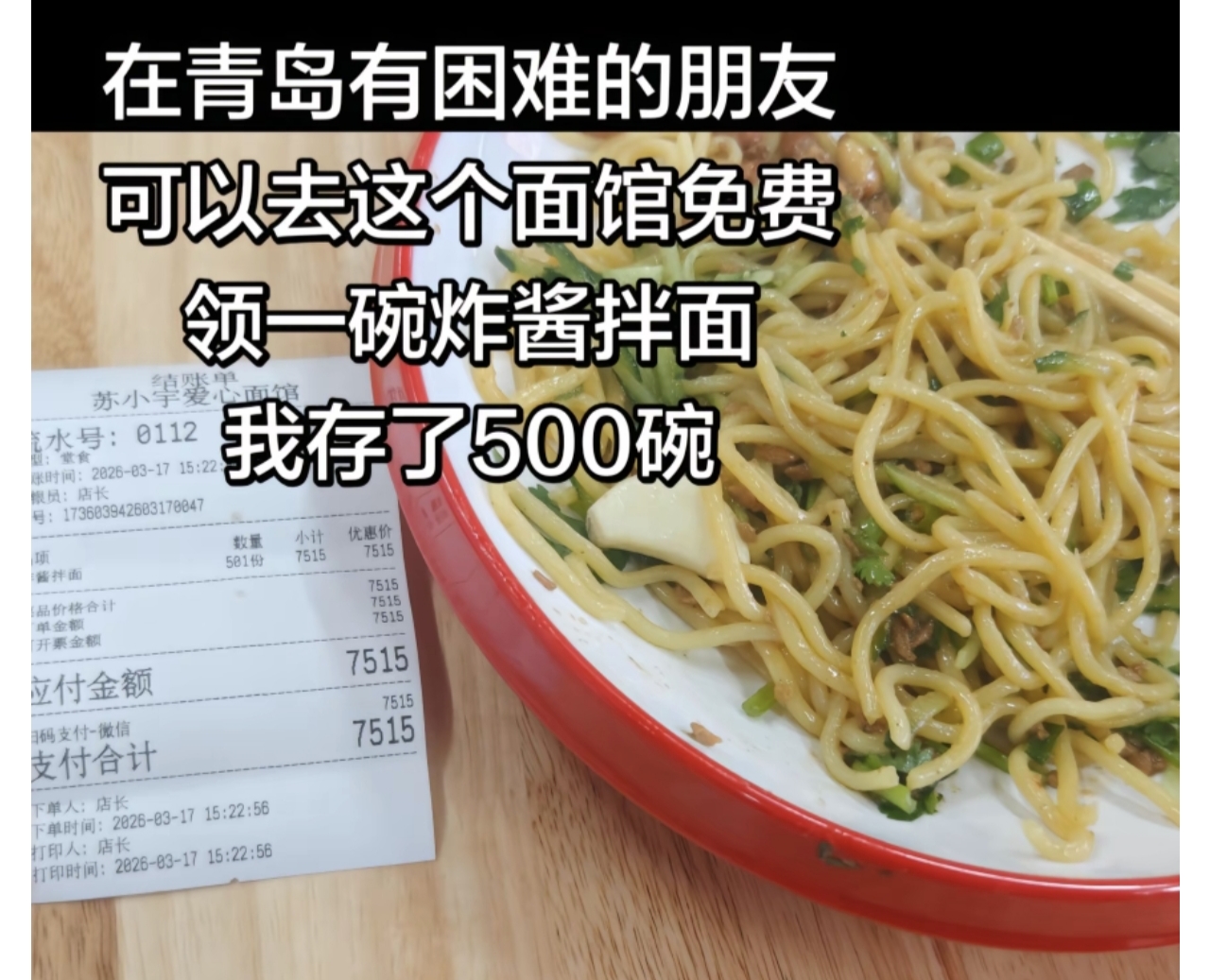 “我今天在张大哥店里存了500碗炸酱拌面,在青岛有困难的朋友都可以去免费吃。要感谢张大哥,我能借他的面馆能传递善良。”这位特殊的顾客婉拒了媒体采访,在社交平台表示有困难可以去免费吃。