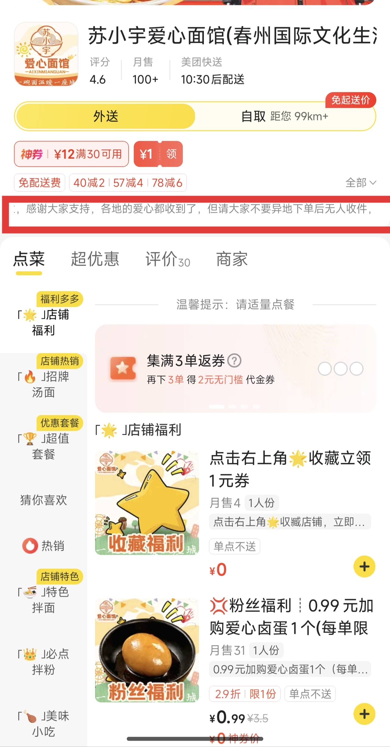 目前,为了不引发误会,张善领关闭了门店的外卖业务,并提醒网友们“新店开业,感谢大家支持,各地爱心都收到了,请大家不要异地下单后无人收件。”